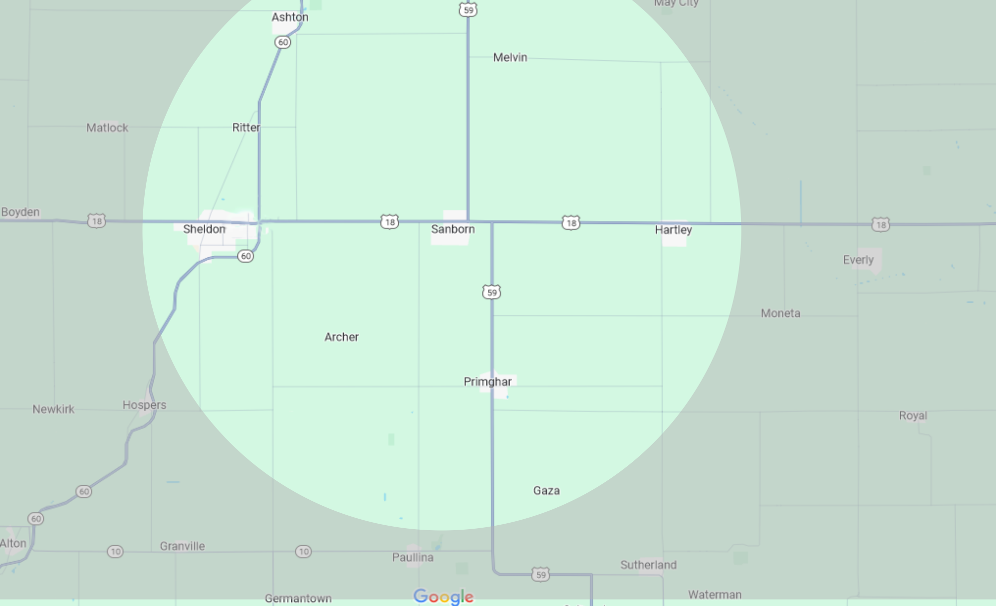 We are located in Sanborn Iowa and generally serve a 10 mile radius in O'Brien County. We may serve customers outside of this area but may require minium charges and mileage fees. We cover Sanborn, Hartley, Primghar, Archer, Melvin, Ashton, and Sheldon.